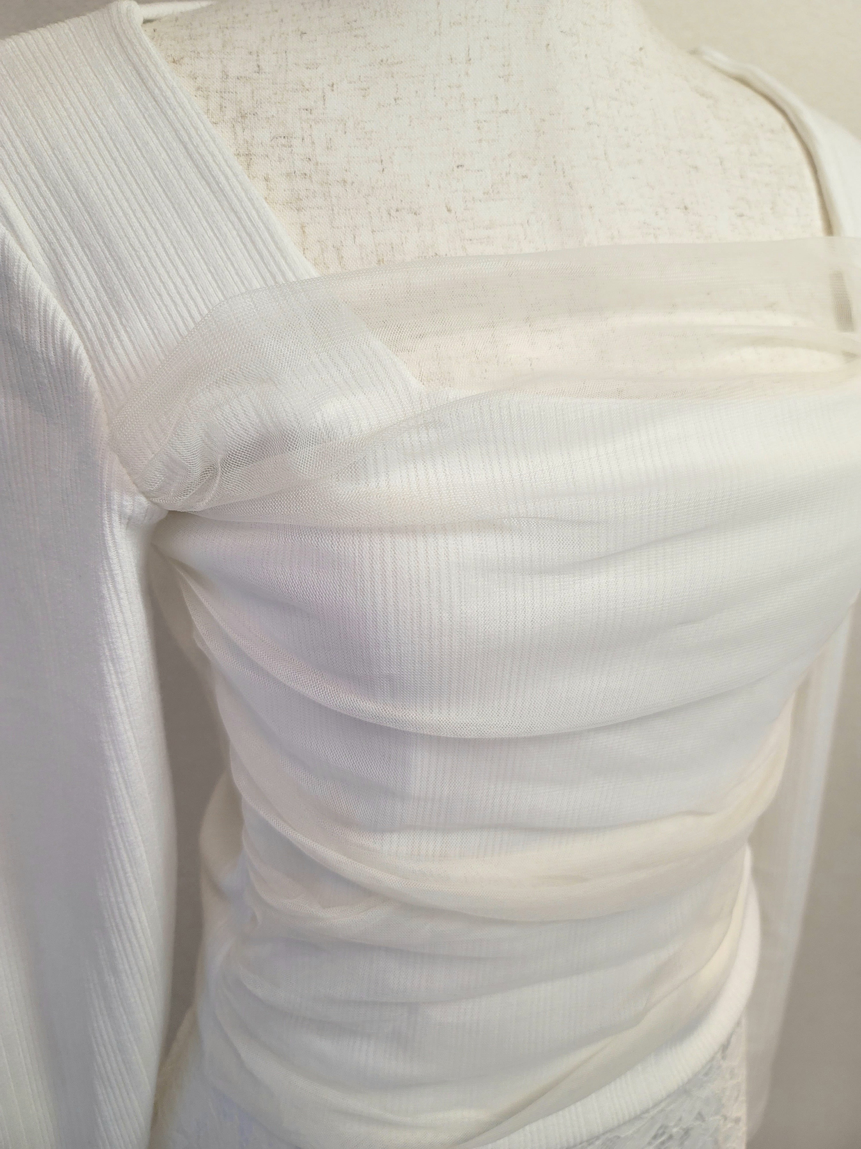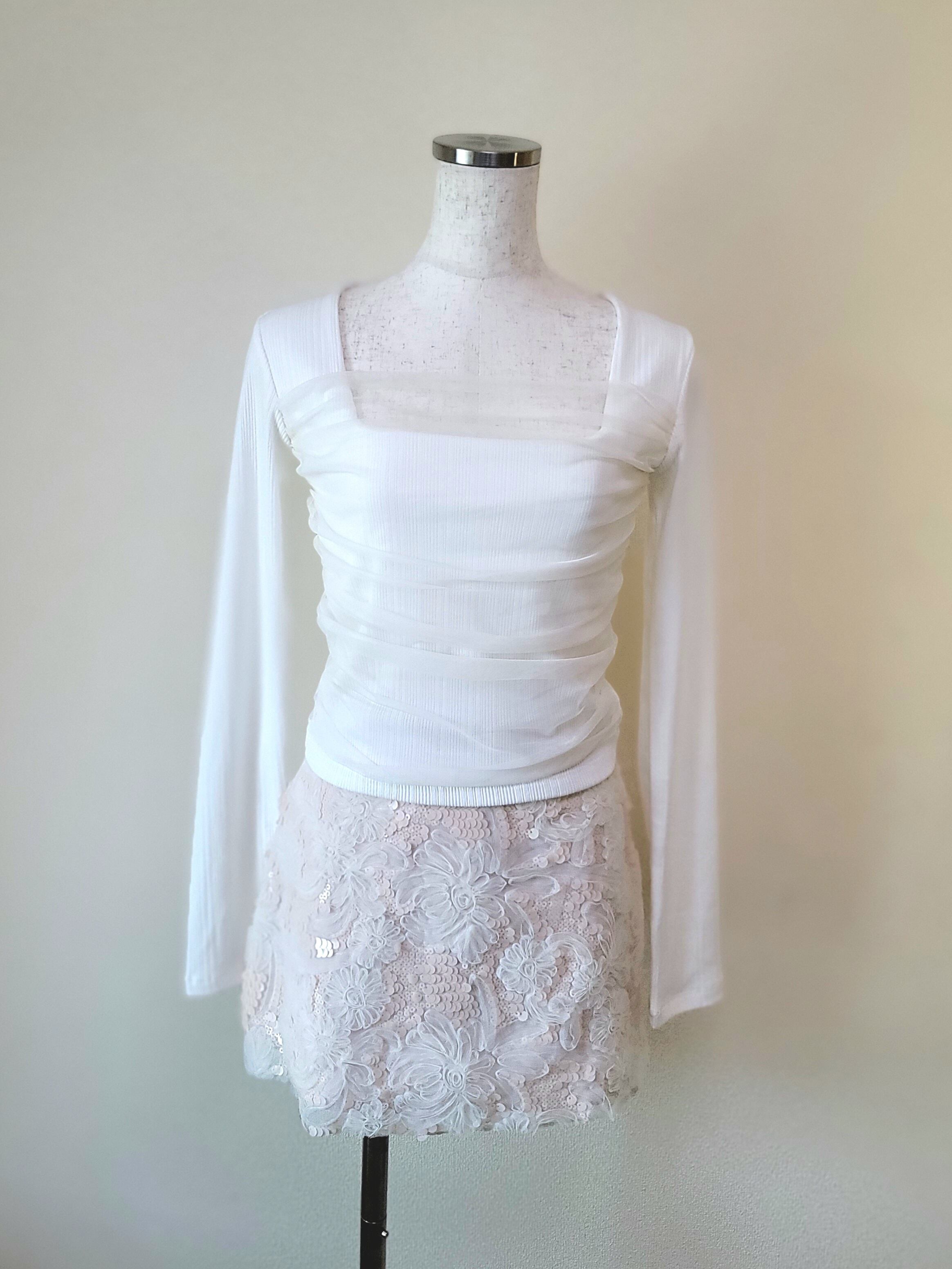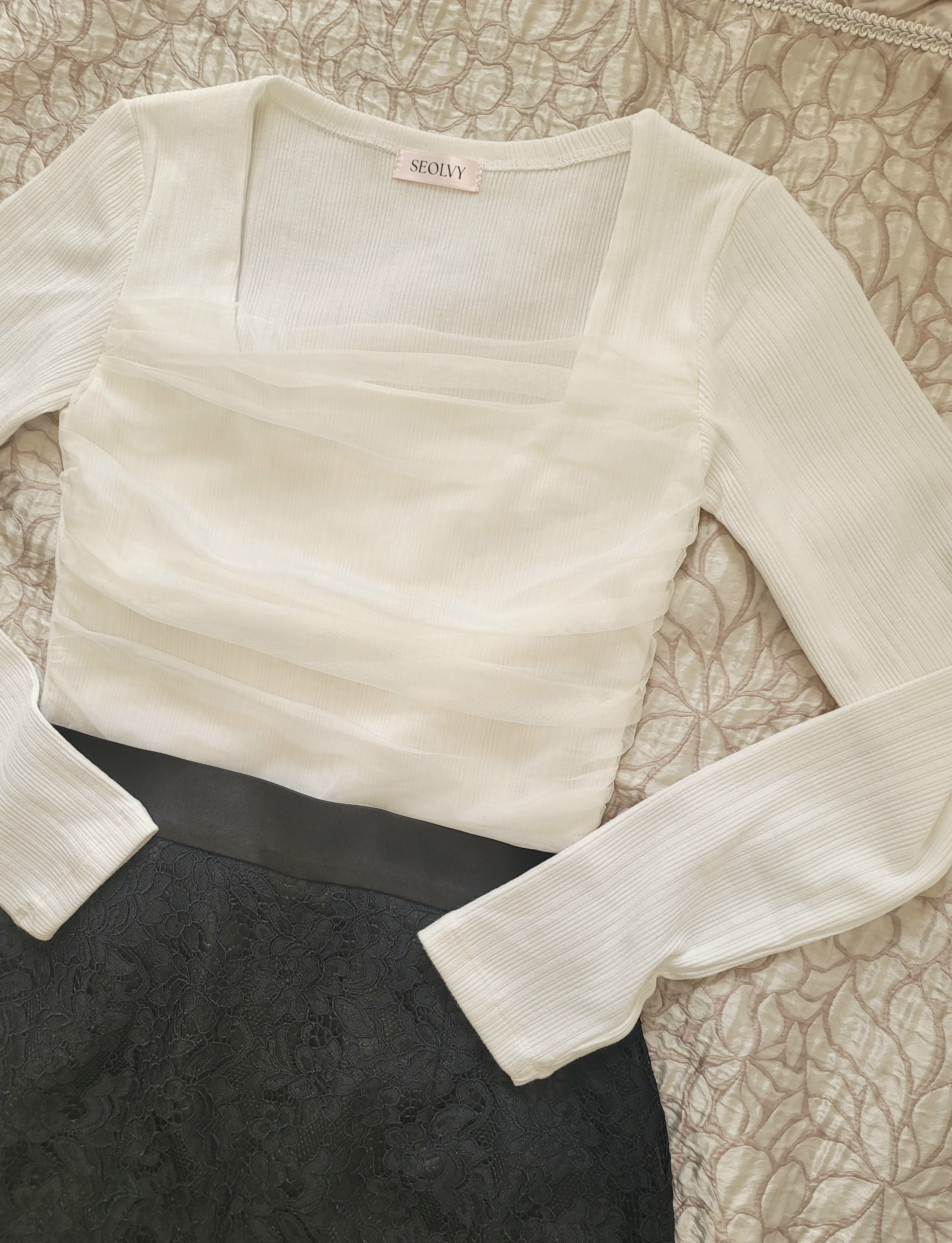 チュールスクエアネック ロングスリーブトップス(アイボリー/ベージュ/ブラック)
