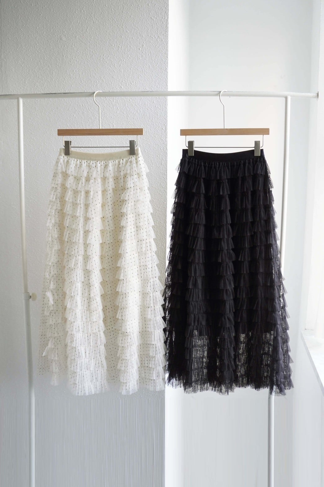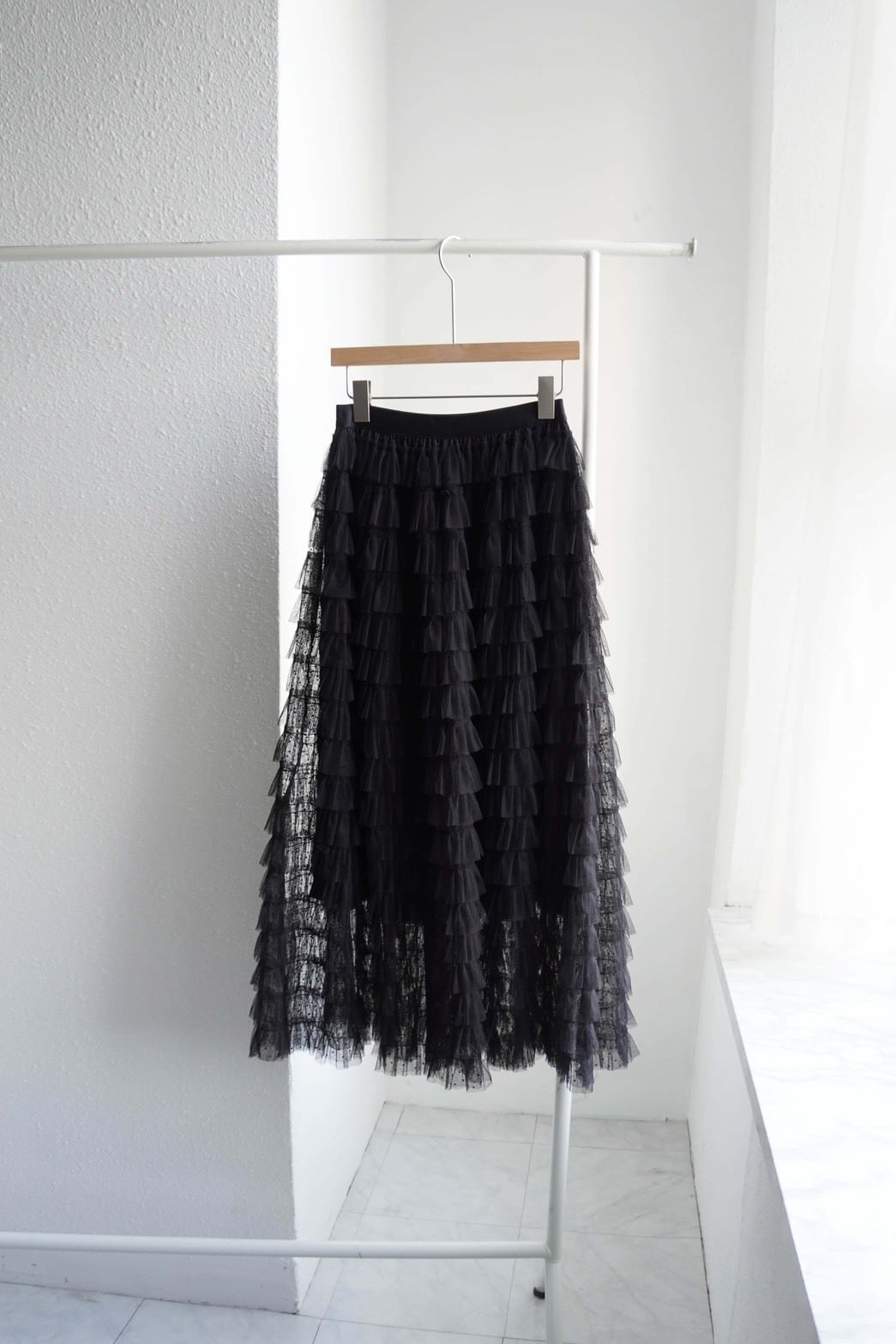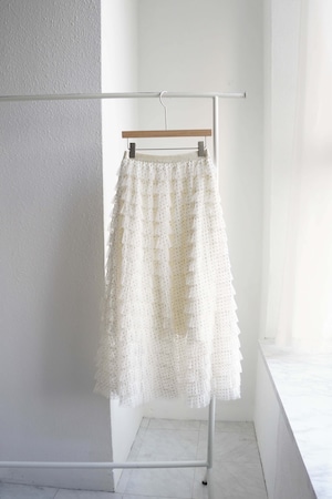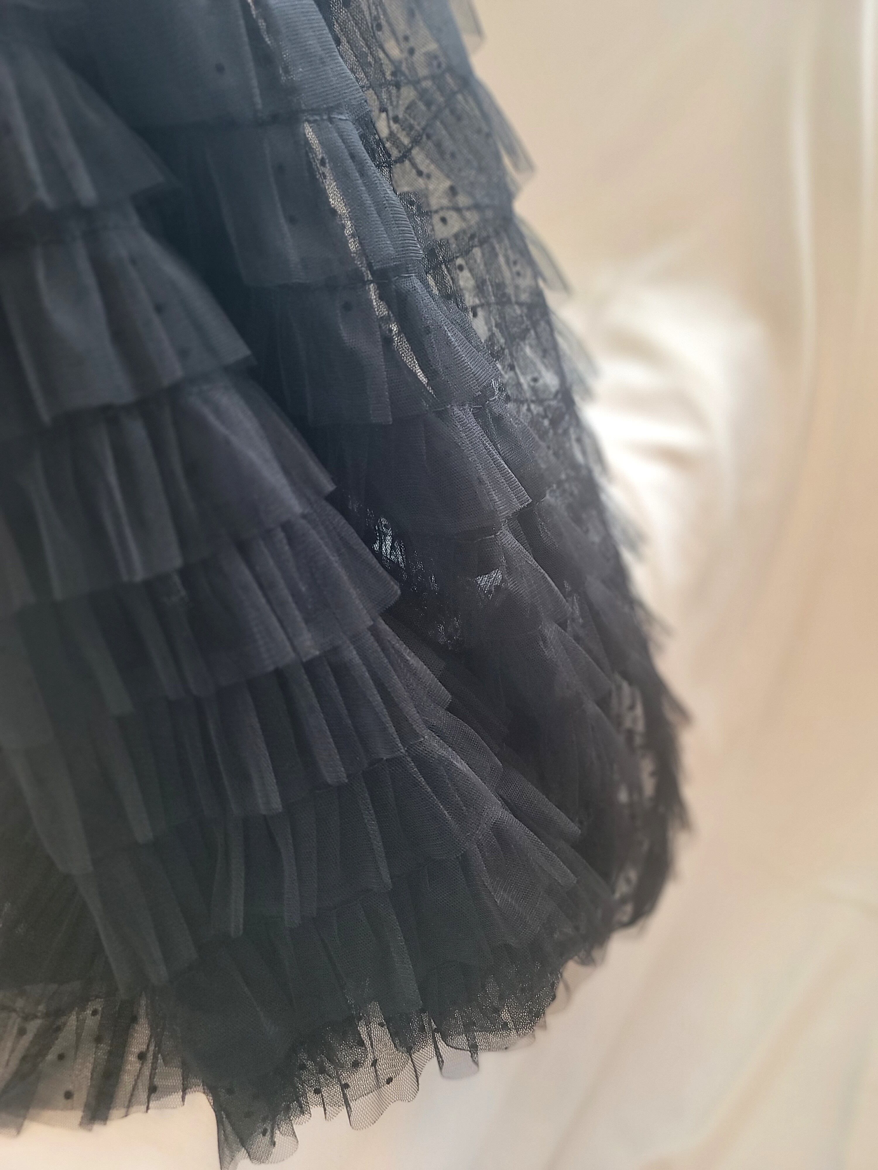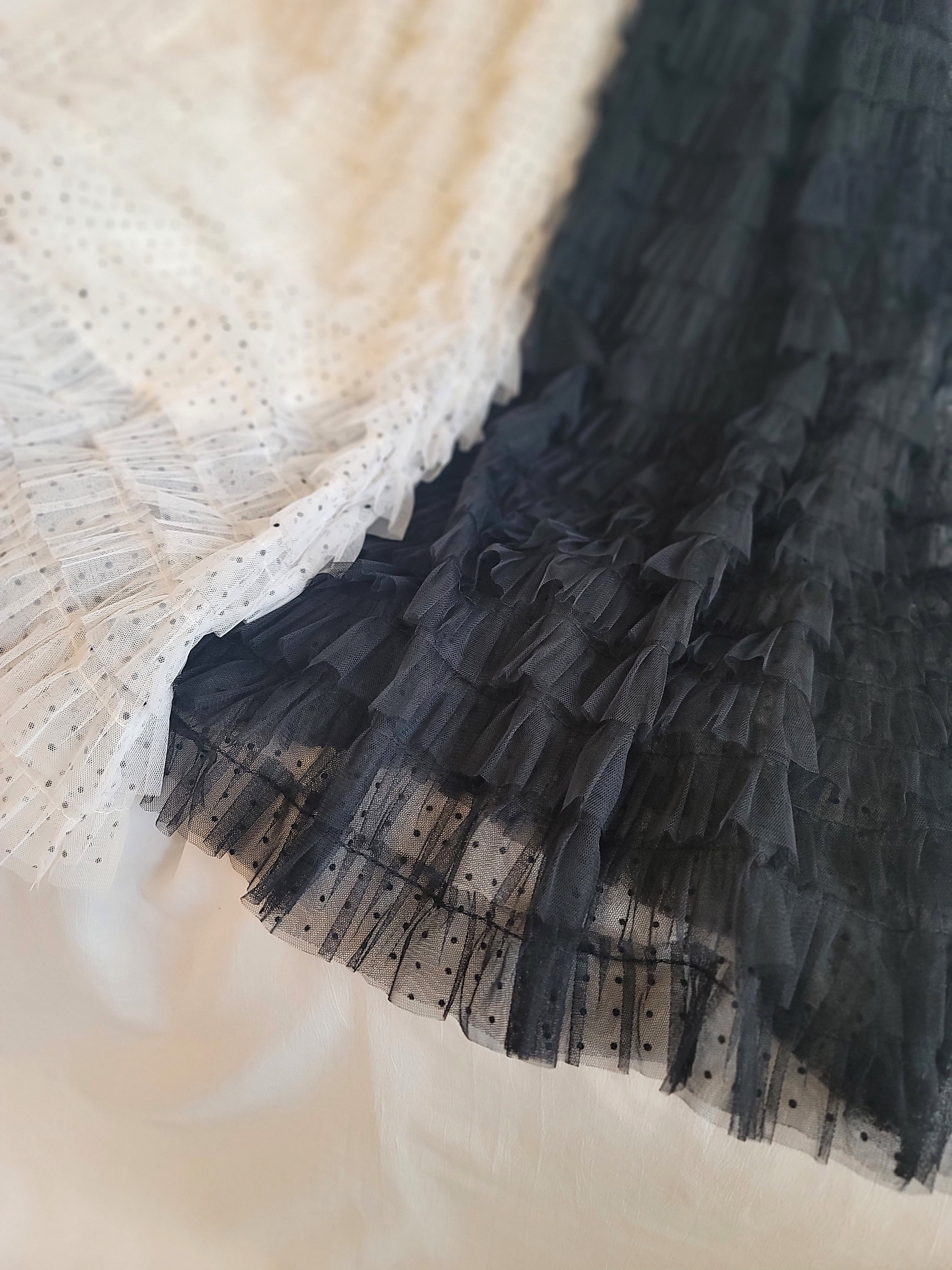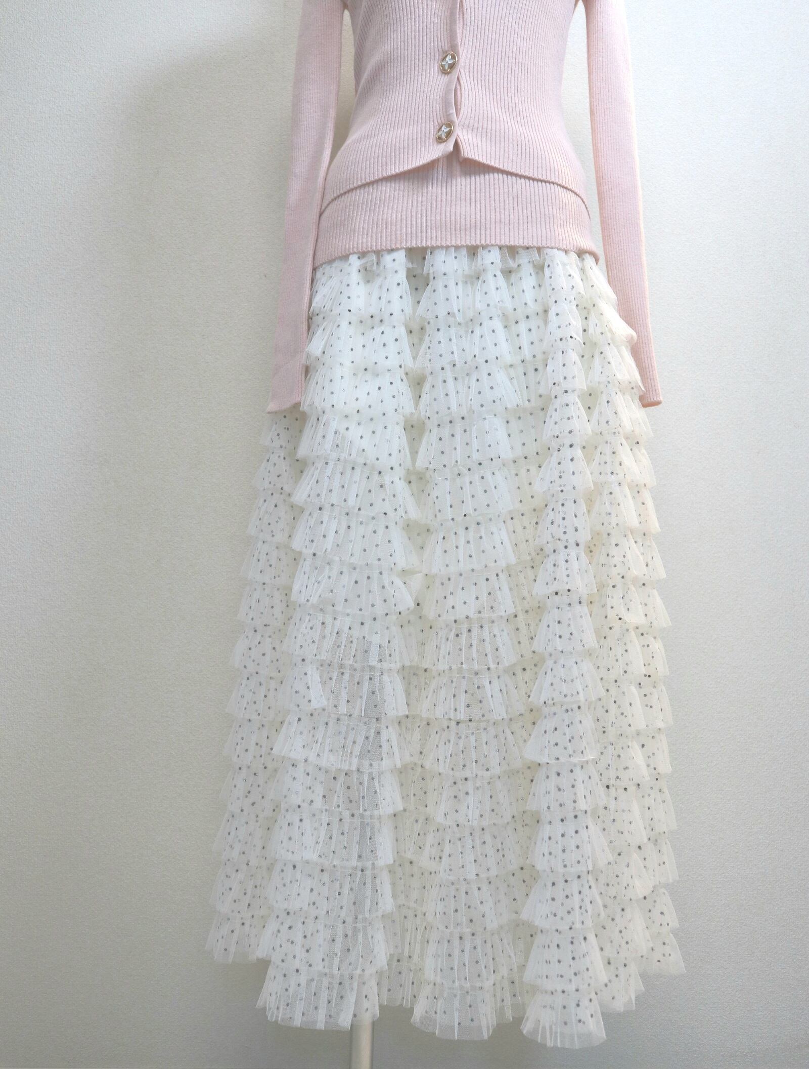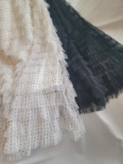 小さなドット柄のチュールを18段重ねたフリルが